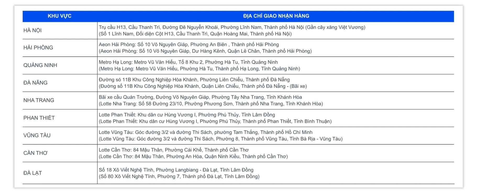 (Quý khách có thể đến giao nhận hàng tại các địa điểm trên hoặc yêu cầu dịch vụ giao nhận hàng tận nơi)